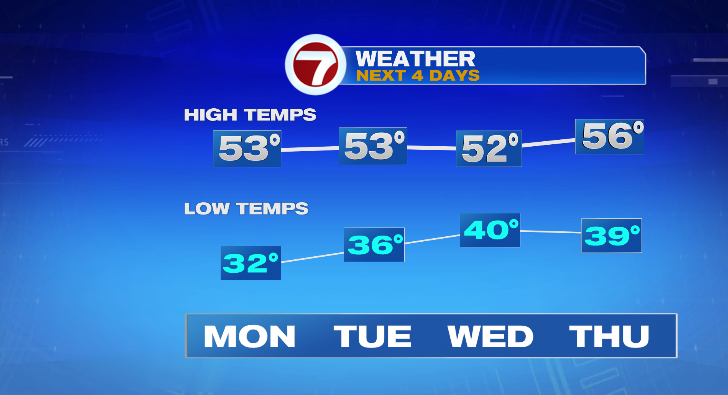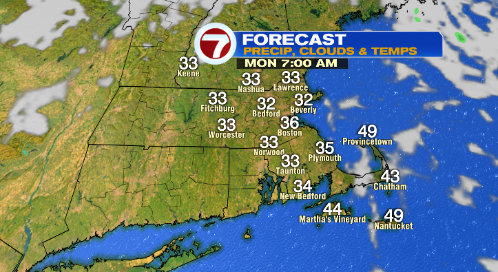 First, clear skies overnight will allow for a strong cooldown early Monday morning as you’re headed out the door to work. Low temperatures will get down to the low 30s!
