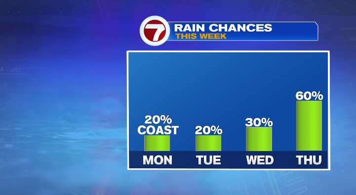 Tuesday morning will be another cold one! Lows will drop to the mid 30s. Skies will be cloudier, and we again can’t rule out a spot light shower on the coast.