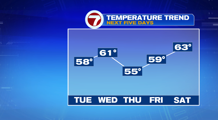 By Tuesday late afternoon, we’ll be completely dry. Highs will still be chilly in the upper 50s with the breeze making it feel a bit cooler.