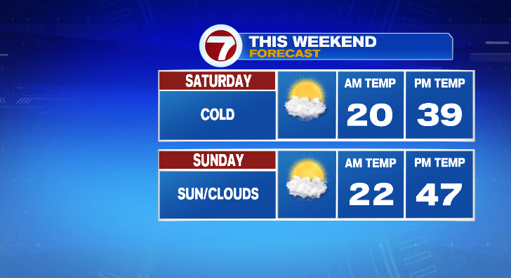 Saturday will be downright cold! Near 20 in the morning with highs in the upper 30s. Sunday, low 20s to upper 40s with partly sunny skies.