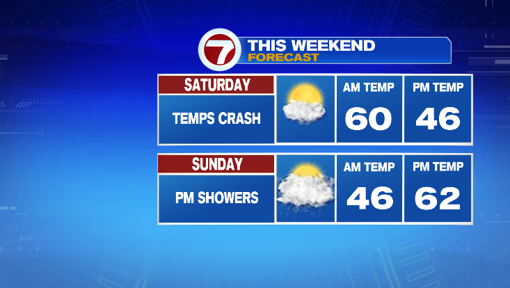 We’ll stay warm into Saturday morning. In fact, we’ll end the morning in the neighborhood of 60 degrees before an abrupt turnaround in temperatures thanks to a back-door cold front (basically think of a cold front that moves “backwards” compared to normal). That will have temperatures plummeting into the 40s by Saturday afternoon. That said, this front doesn’t have much moisture to work with, and the day will stay dry, though we’ll see some clouds and a breeze as well.
